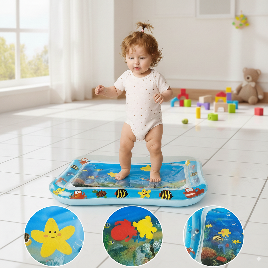 Water mat encourages motor skills, neck strength, and sensory play.